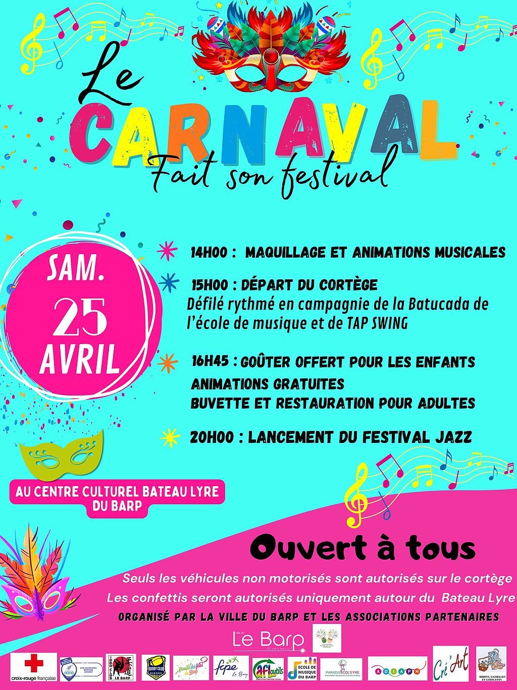 La ville du Barp, l’association carnavalesque barpaise, les associations des parents d'élèves, l'école de musique, la Gym Volontaire, le Rugby Club Barpais, le Judo Club, AFL Outils, le Comité des Fêtes, Cré’Art, B2G et l’ADIAPH vous ont préparé une journée inoubliable, pour petits et grands !