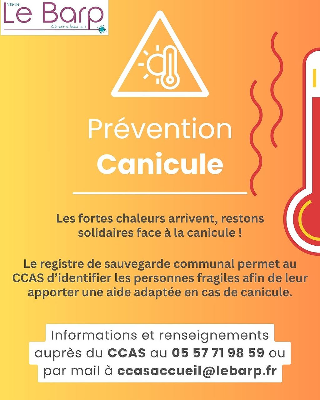 Informations et renseignements auprès du CCAS au 05 57 71 98 59 ou par mail à ccasaccueil@lebarp.fr