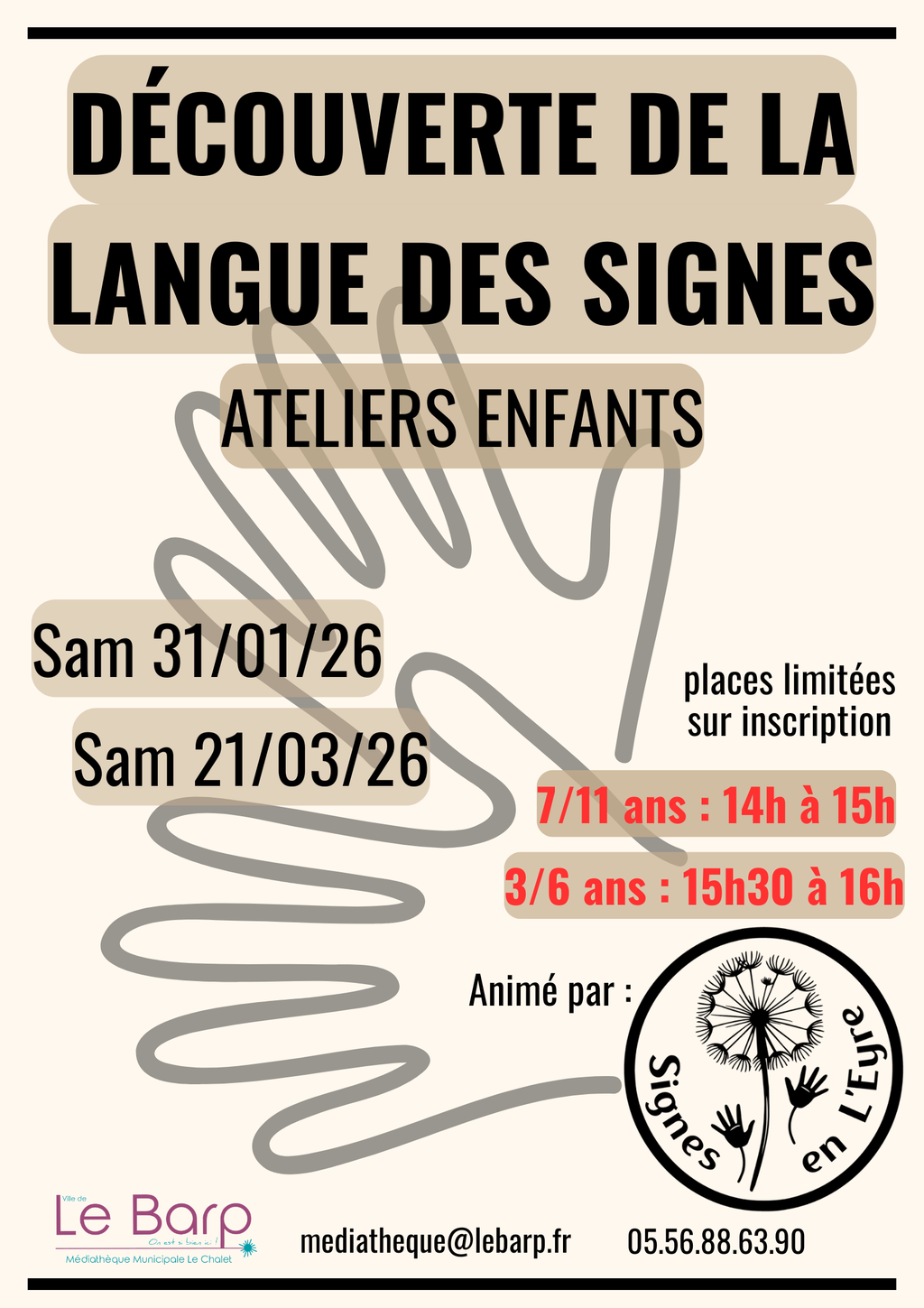 Les places étant limitées il est demandé de s'inscrire auprès de la médiathèque au 05.56.88.63.90 ou par mail à mediatheque@lebarp.fr en précisant la date choisie et l'âge de l'enfant.